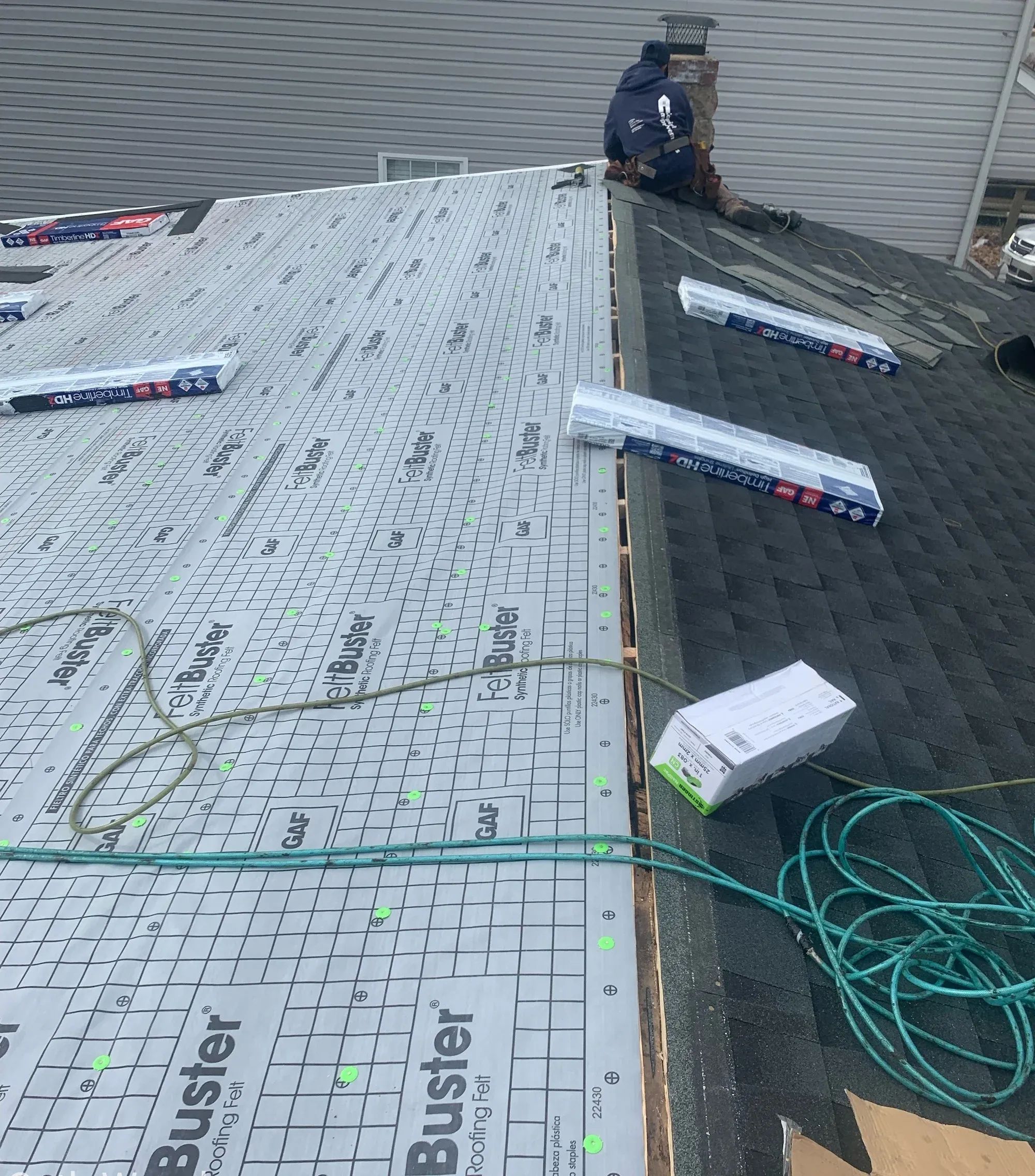 • Roof installation in progress showing underlayment and GAF Timberline HDZ® shingles